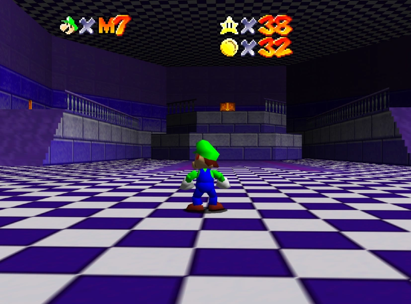 This area is reminiscent of the castle's beta lobbies on a larger scale, with purple-toned textures. Its structure appears to be a bigger version of Cryptic Hideout's main room. The only painting is found in a room through a door on the left, containing a black canvas; there is no door on the right side of the lower floor. Instead of stairs, beta-style platforms lead to the double doors to the upper floor.